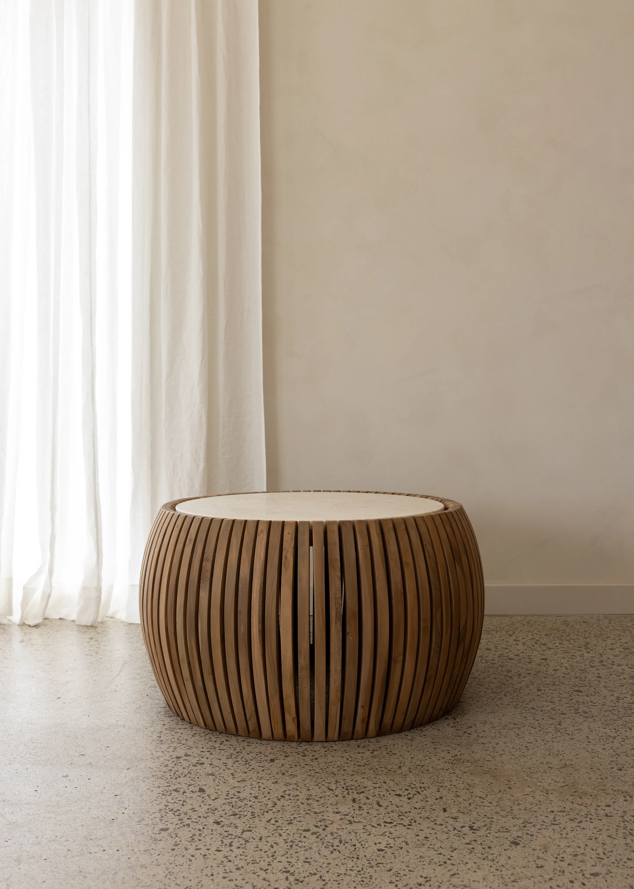 Elevate your space with the magnificent Nate Coffee Table, a striking yet simple inclusion to any living environment. Showcasing a graceful marble inlay that beautifully complements the organic teak paneling, its curved structure brings a sense of fluidity and gentleness to your home.