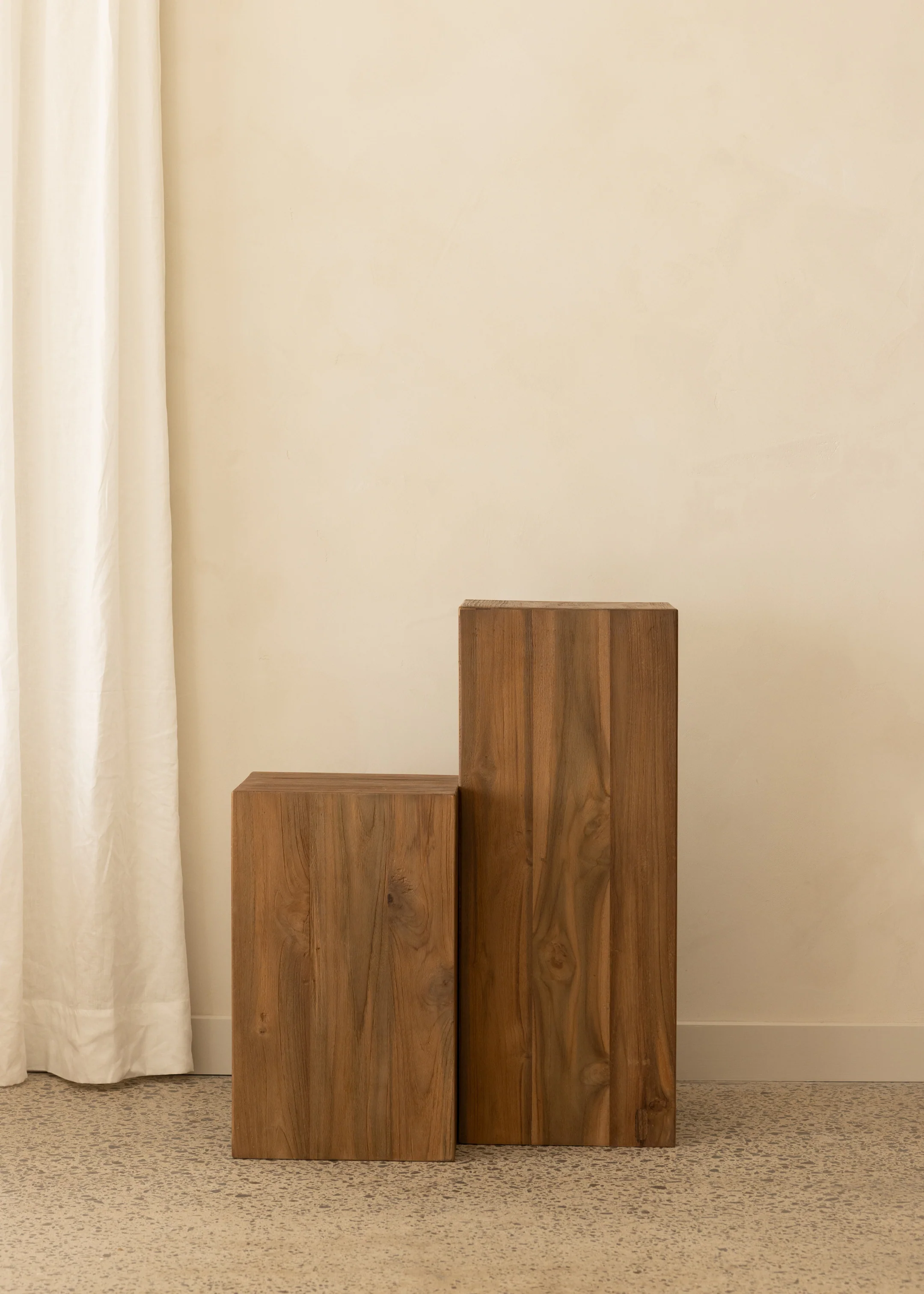 The Sierra Plinth in Dark Teak is crafted from reclaimed teak boards creating a hollow box and showcasing the warmth and character of its wood grain. These plinths are all different; each one having its own unique character, texture, and intricate details. To be used as a side table, individually or clustered, or as a display for your special objects like a vase, books, photo frame, candles, a lamp, a room diffuser, a plant... the options are endless.