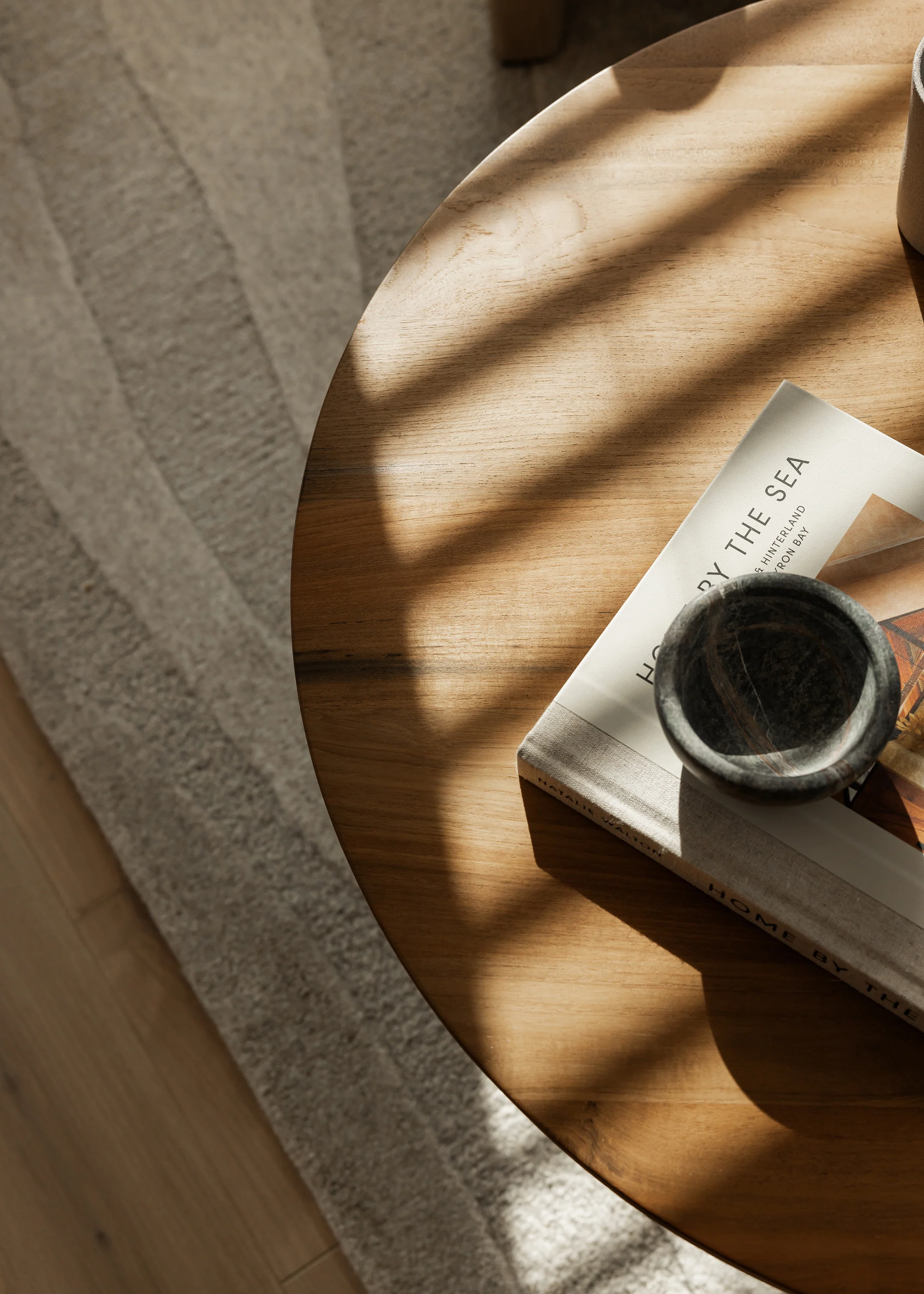 The Tiram Coffee Table in Natural features a unique cone base and a tapered round tabletop. Crafted from high quality teak, this coffee table showcases the natural beauty of the wood, highlighting its rich grain patterns and warm tones.